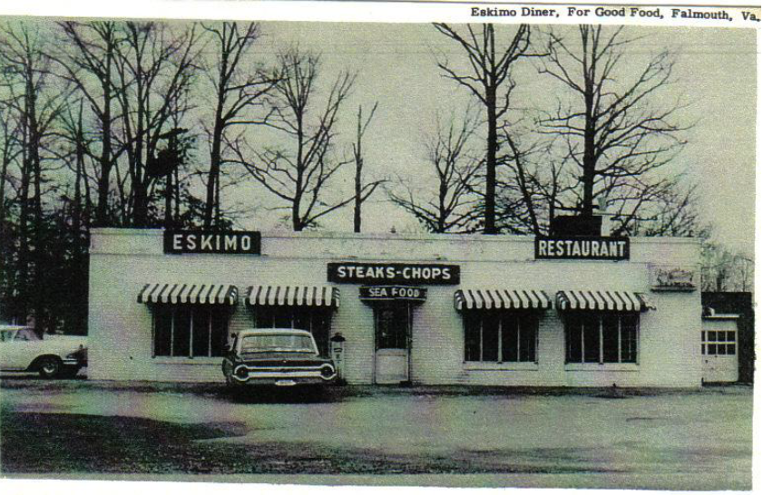 Today the Eskimo Diner stands as a vacant building next to the road that takes people to the Stafford Regional Landfill. Their postcard said, “Good Food, Falmouth, Va., Steaks-Chops-Seafood.”