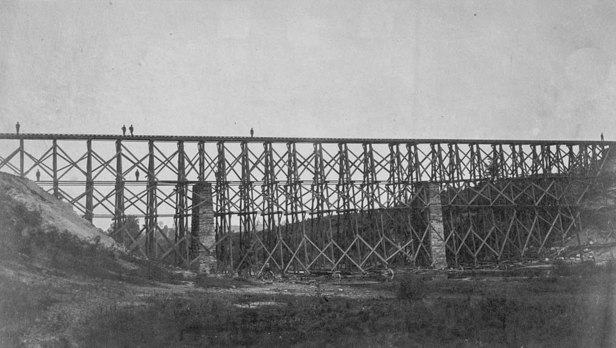 The Potomac Creek Bridge was constructed in May 1862 by the United States Military Railroad Construction Corps. Built in an astonishing 40 hours under the direction of Union engineer Herman Haupt, the massive wooden trestle carried the United States Military Railroad supply line supporting the Army of the Potomac during the Peninsula Campaign. Rising roughly 80 feet high and stretching about 400 feet across Potomac Creek, it was assembled from timber cut from nearby forests and famously constructed without metal bolts. The bridge became a symbol of Union logistical ingenuity, demonstrating how rapid railroad construction gave Federal forces a crucial strategic advantage.