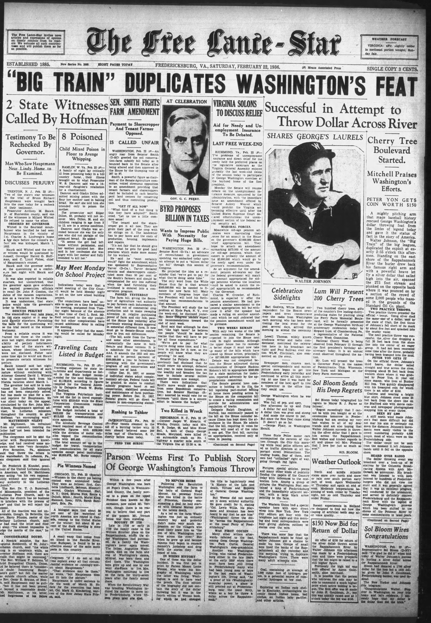 National attention briefly focused on Fredericksburg 90 years ago today, February 22, 1936, a Saturday, as the community marked George Washington’s 204th birthday with grand gestures and spectacle. Dignitaries arrived to dedicate the Cherry Tree Memorial Boulevard, a stretch of King’s Highway to be lined with cherry trees between Chatham Bridge and Washington’s boyhood home at Ferry Farm, then in private hands. Media interest, however, centered on the attempt by baseball legend Walter Johnson to duplicate the first president’s childhood feat of tossing a coin across the Rappahannock.