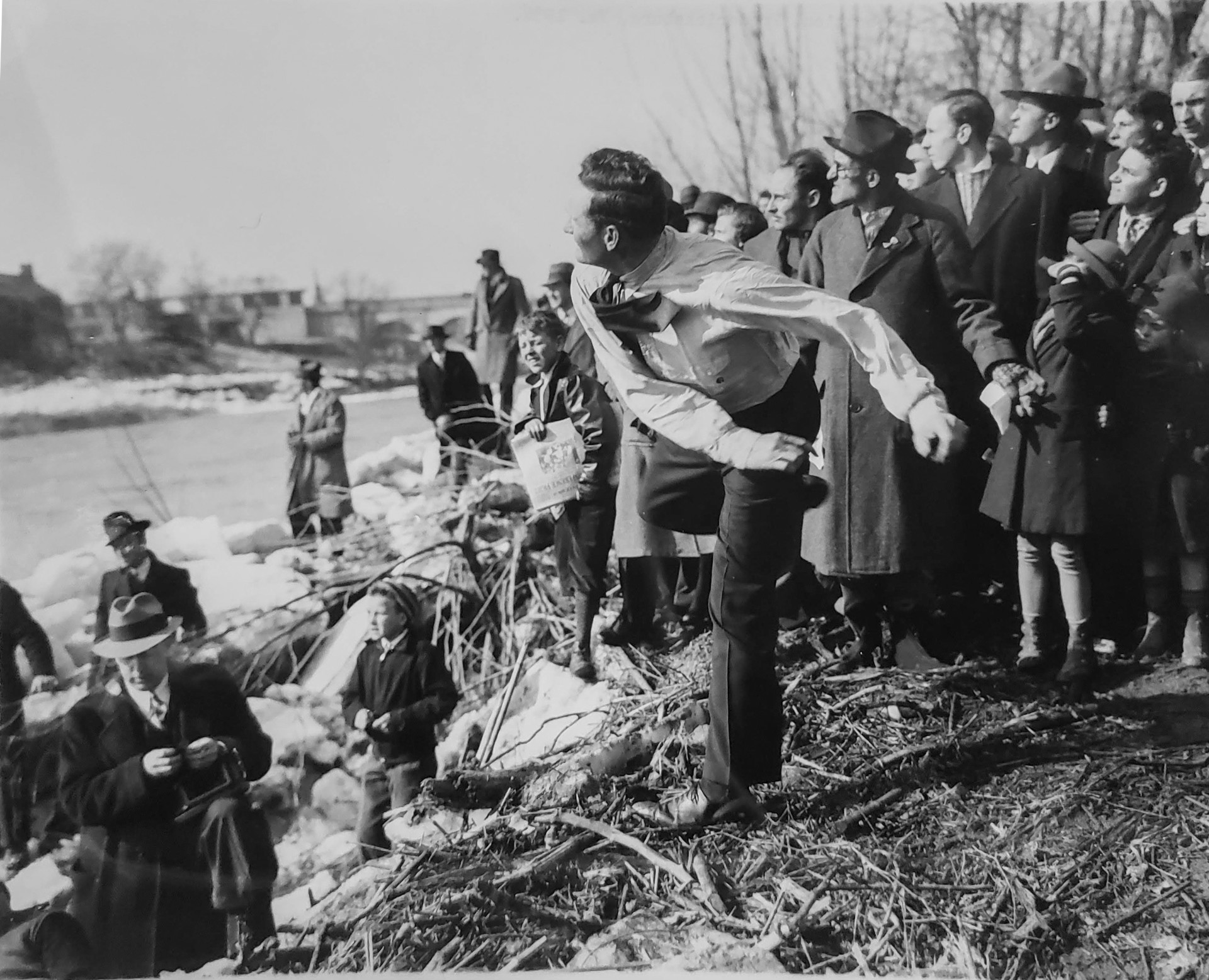 Spectators lined the banks of the Rappahannock on both sides. Standing in shirtsleeves on the ice-strewn east bank, Johnson made two practice throws with silver discs, with reporters and cameramen recording every move. The first throw landed in the water a few feet short of the farther shore. The second landed about 20 feet beyond the opposite river bank. Then came the official throw with a silver dollar inscribed for the event. The third and final throw sailed across the river, landing at the feet of Peter Yon, an Italian mason who worked at Fredericksburg and Spotsylvania National Military Park building the park’s bridges and culverts. Although eligible for a reward for retrieving the coin, Yon held on to his souvenir, awaiting higher offers. (He apparently never collected.)