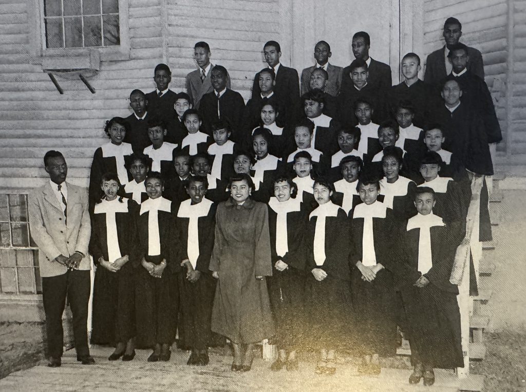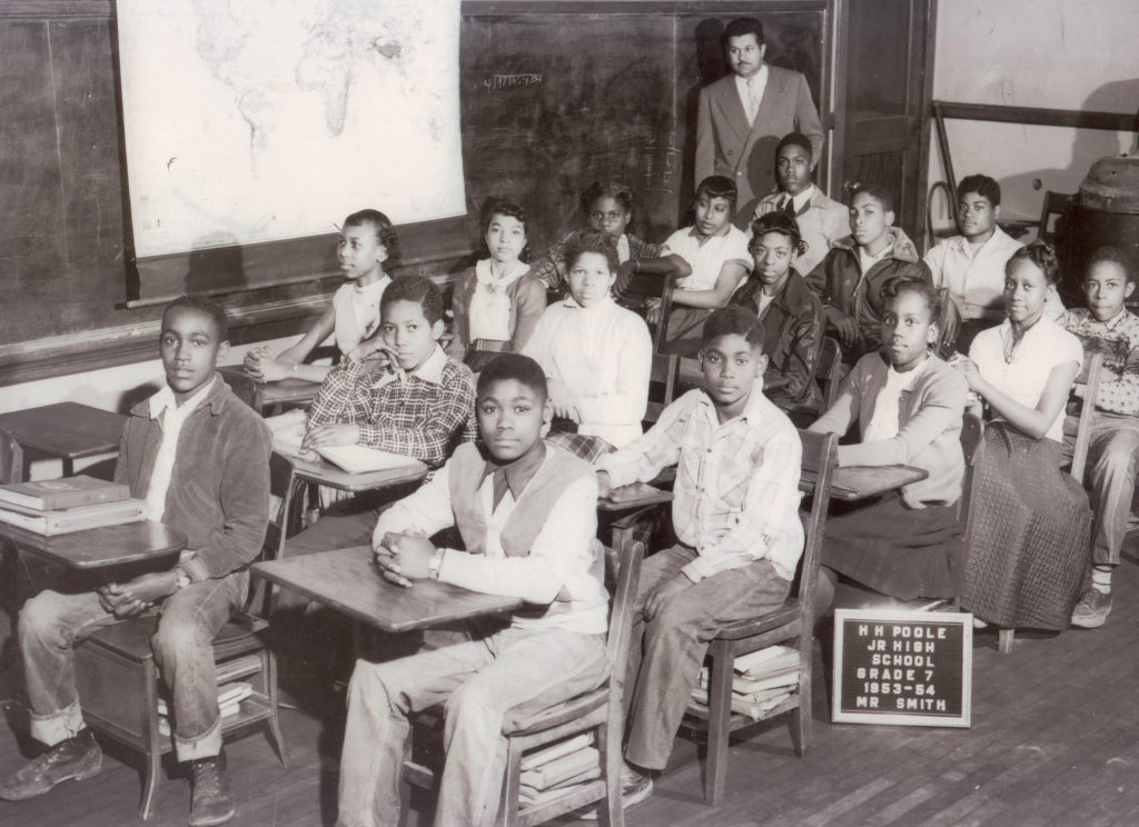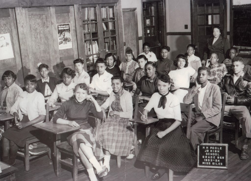 Edward Smith is shown here with his 7th grade junior high class in 1953-1954. He was later the principal of the high school and worked earnestly behind the scenes to effect integration. Ella Rowser was a popular teacher at Poole. The building would later be renamed in her honor.
