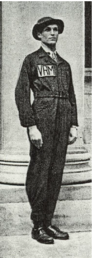 VRM “Minute Man” — “Minute Men” wore a forest green fatigue-type jump suit, floppy fatigue hat of the period, and low-quarter shoes. The large letters “VRM” were sewn over the right breast in line with the left upper pocket. The uniform, which cost $3.95 for the coverall and 95 cents for the hat, would add the appropriate rank or chevrons for officers and noncommissioned officers. A far cry from the stuff of glory and a clear break from earlier days, the uniforms were at least functional. [Richmond News-Leader]