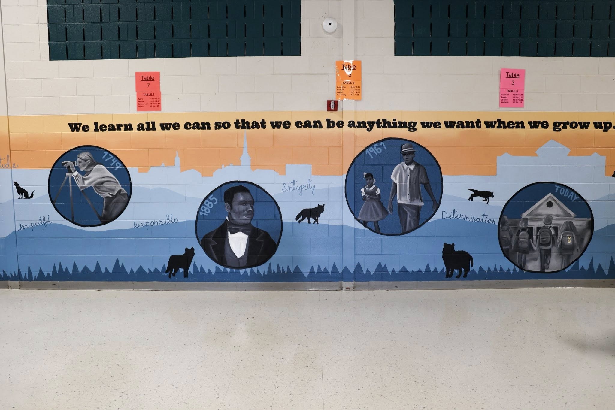 Rockhill Elementary’s mural portrays items in Stafford’s history related to the Underground Railroad, such as Henry Box Brown and a coded quilt on a clothesline.