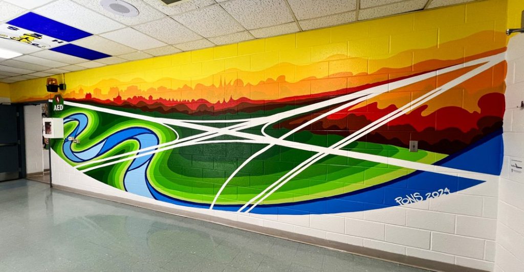 Titled Hartwood Passages, the mural artwork is a bird’s eye view encompassing South Stafford County, Falmouth and Fredericksburg. Pons’s intention was to depict the region as an abstracted visual text, highlighting historic architectural landmarks in Hartwood as well as encouraging the viewer to explore and ask questions about other key geographic elements. Roads are interpreted both literally and metaphorically. The intersection of Interstate 95 and Route 17 creates an “X” through the center of the mural and other major throughways including route 1 and the railways, depicted as vertical stripes cutting through the landscape. The Rappahannock River, so critical to the region’s history and development, is rendered as a bold sinuous ribbon stretching from end to end, alluding to its prominence in the region. The artwork rounds out to a smooth curve at the base, referring to the global community that students participate in. The composition aims to ordinate the viewer, encouraging them to inquire about the cardinal directions, the landscape’s topography, and their own location relative to Hartwood Elementary.