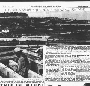 The late D.P. Newton said that there is a house near Grafton Village built from timbers of one of the ships. The ships were towed across the Potomac to Mallows Bay, Maryland. The area had been a dumping ground for abandoned ships, even a Revolutionary War ship, for over a hundred years. This was a large fleet, between 100 and 200 ships (depending upon the reference). The ships continued to leach pollutants. At sunrise one morning in the 1920s, the ships were burned to their waterlines. Stripping the hulls of anything that could be recycled, primarily metal, became a cottage industry for locals. It is said Japan was the best market for the metal. At the beginning of World War II, Bethlehem Steel had a metal recycling operation.