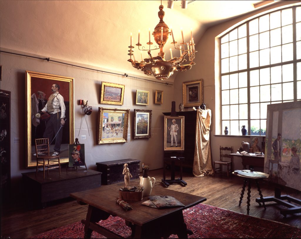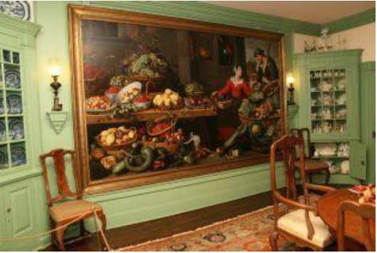 In their travels and residences both here and abroad, the Melchers amassed a rich and varied collection of antique furniture and carpets, fine china and pottery, and paintings and prints by Old Masters as well as new. Notable among the furnishings are a French Savonnerie carpet and a Dutch Rococo secretary. Shelves are stacked with Chinese export porcelain and Delft and Wedgwood dishes. Other highlights include important American miniatures by Raphaelle Peale and Henry Benbridge, Flemish portraits attributed to Cornelis de Vos and Wybrant de Geest, a Dutch still life attributed to Balthasar van der Ast, and a monumental Market Scene produced by the workshop of Flemish painter Frans Snyders. Finally, the works of Corinne Melchers, an artist in her own right, are displayed here, including The Model, a clever “picture within a picture” portrait of her husband at work. Virtually all the couple’s personal possessions remain with the estate so that the spacious interiors of their day have been carefully reproduced and reflect their very individual and eclectic tastes.
