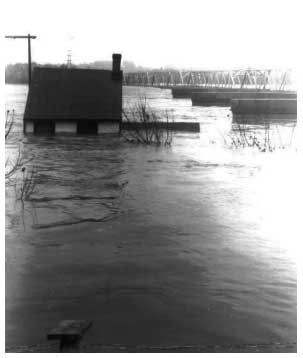 At that point, all that had been completed of the new bridge was the pouring of the concrete piers. The flood waters actually submerged these and, after the water subsided and work resumed on the new bridge, engineers added another five feet of concrete to the tops of the piers to provide extra height. These may be viewed from beneath the current bridge. Raising the height of the bridge deck required realigning and raising Route 1 as it approached the bridge, thus accounting for the present configuration.