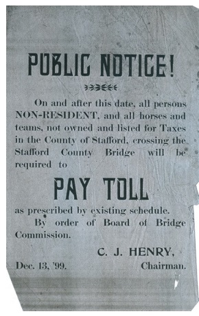 In the fall of 1889 Fredericksburg decided to take over the Chatham Bridge, previously a toll bridge, and make it free. Thus, Stafford assumed financial responsibility for both the Falmouth Bridge and for Fredericksburg with the one at Chatham.