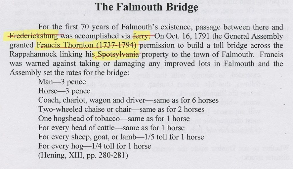 In 1847 Joseph B. Ficklen purchased the Falmouth bridge from Dunbar’s heirs, still subject to the Thornton annuity. Like Robert Dunbar, Ficklen collected tolls from those who used the bridge.