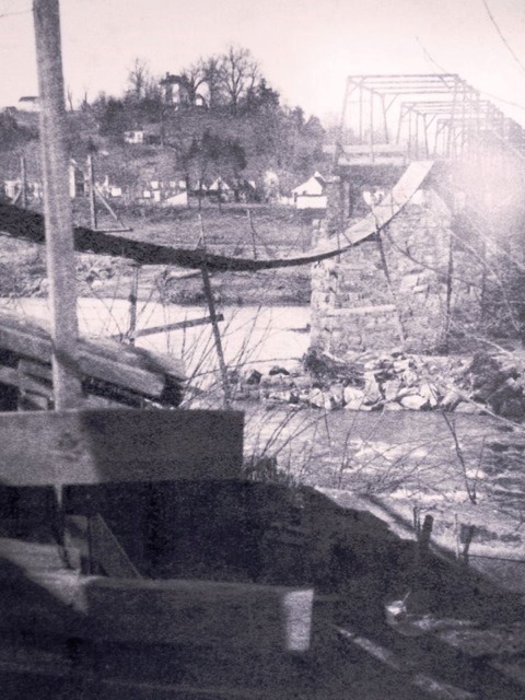 The bridge was severely damaged by flooding in 1937. For several years a narrow swinging footbridge connected the Falmouth side of the river with what remained of the bridge. Many Falmouth residents worked in Fredericksburg and having a means of crossing the river was a necessity. The only other option was to walk down River Road and use the Chatham Bridge. Construction of a new bridge finally commenced in 1942. In November of that year one of the worst floods of the river’s recorded history sent water over the top of the deck of what remained of the previous bridge and effortlessly twisted the steel superstructure.